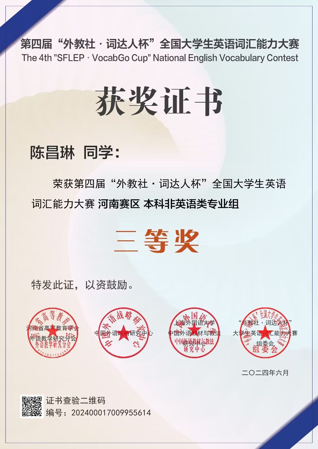 陈昌琳在全国大学生英语词汇能力比赛中荣获河南赛区本科非英语类专业组三等奖